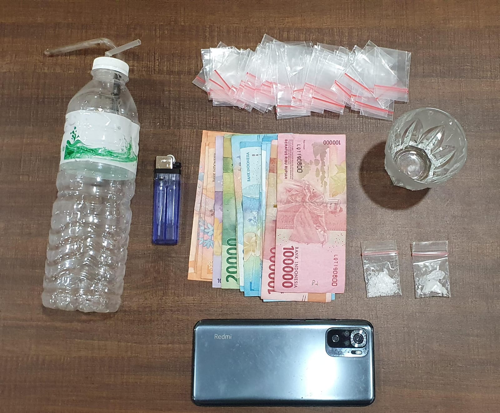 Barang bukti yang berhasil diamankan antara lain : 2 paket sabu seberat masing-masing 1 gram, Seperangkat alat hisap berupa bong, 30 plastik klip kecil, uang tunai sebesar Rp 680.000, dan 1 unit ponsel.