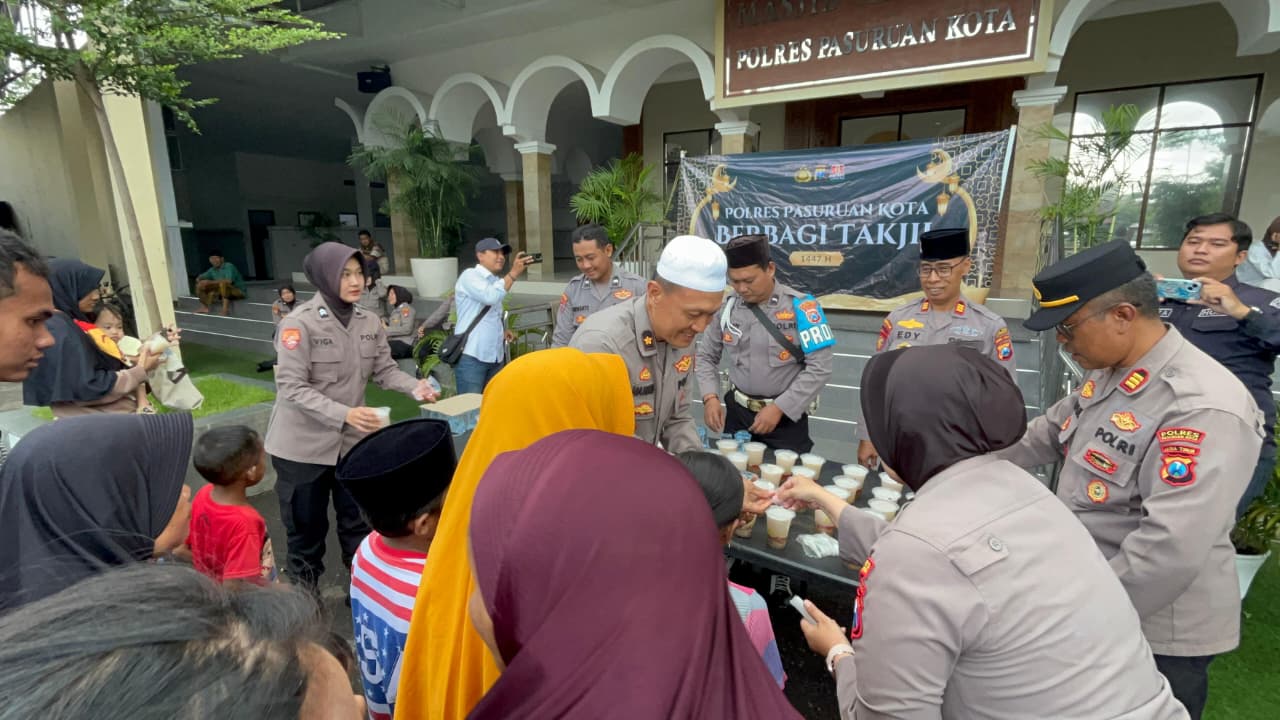 Sejak sore hari, personel Polres Pasuruan Kota bersama jajaran terlihat membagikan takjil kepada pengendara roda dua, roda empat, hingga pejalan kaki yang melintas di depan Mapolres Pasuruan Kota. Masyarakat pun tampak antusias menerima takjil yang dibagikan menjelang waktu berbuka puasa.