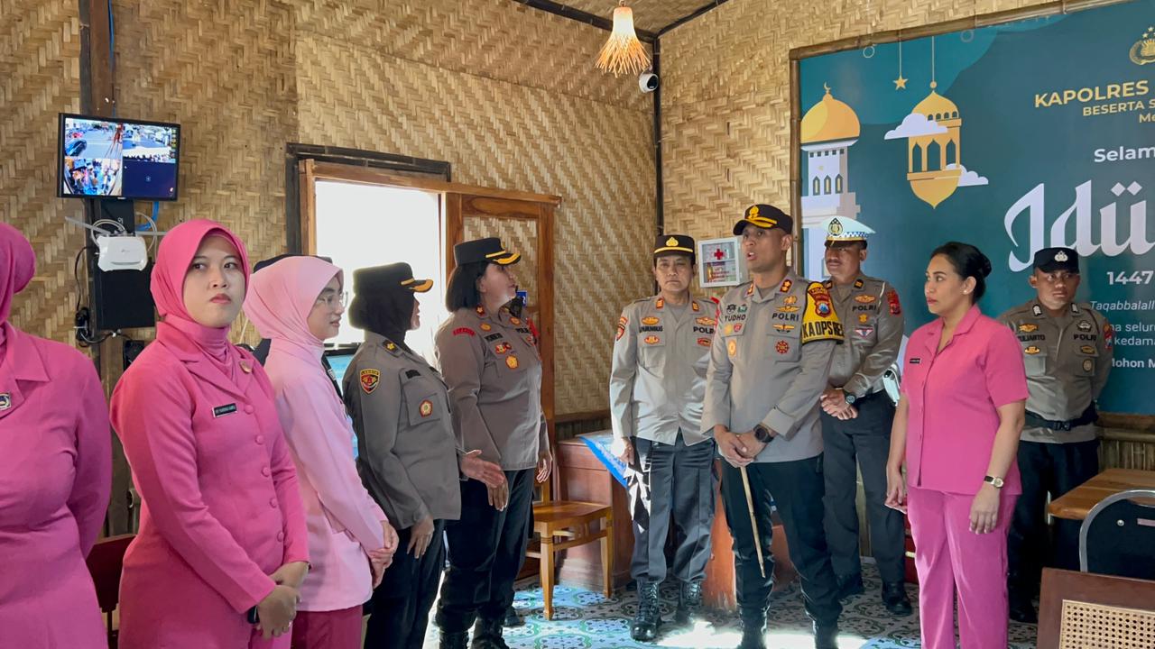 Polresta Pasuruan – Kapolres Pasuruan Kota AKBP Titus Yudho Uly, S.I.K., M.Si. didampingi Ketua Bhayangkari Cabang Pasuruan Kota Ny. Desna Yudho, bersama pejabat utama Polres Pasuruan Kota serta pengurus Bhayangkari, melaksanakan kunjungan ke Pos Pelayanan Alun-Alun Kota Pasuruan dalam rangka memastikan kesiapan pengamanan menjelang Hari Raya Idul Fitri. Rabu (18/3/2026).
