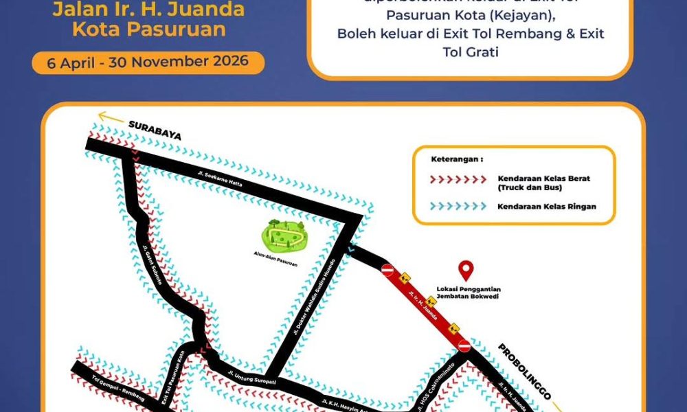 Polresta Pasuruan — Penutupan total Jalan Ir H Juanda Kota Pasuruan resmi diberlakukan mulai Rabu (08/04/2026). Kebijakan ini dilakukan sebagai dampak dari pembongkaran Jembatan Bok Wedi...
