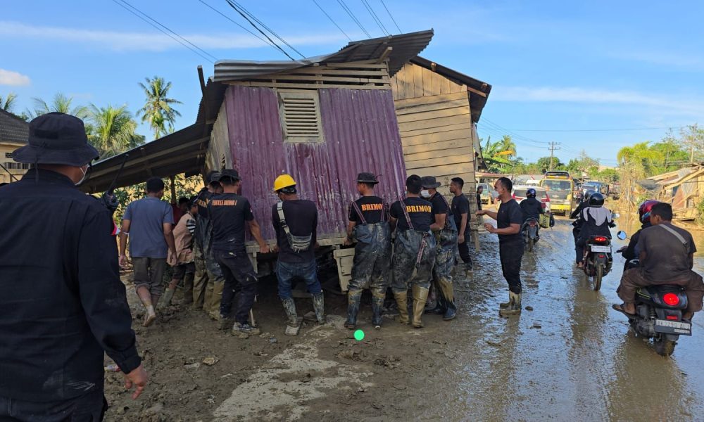 Kuala Simpang — Personel Brimob Polda Aceh bergerak cepat memindahkan sebuah rumah warga yang terseret banjir bandang hingga melintang di badan Jalan Nasional Langsa —Tamiang. Upaya...