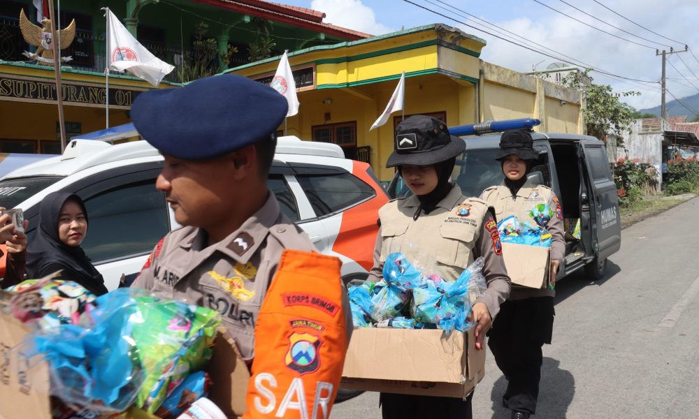 LUMAJANG – Personel Brimob Polda Jawa Timur (Jatim) bersama Polres Lumajang membagikan snack dan susu kepada anak-anak sekolah di Dusun Sumbersari, Desa Supiturang, Kecamatan Pronojiwo, Kabupaten Lumajang, Kamis (27/11). Kegiatan ini menunjukkan kepedulian...